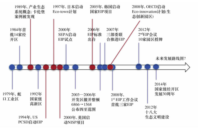 生態(tài)工業(yè)園區(qū)是產(chǎn)業(yè)生態(tài)學(xué)研究和實(shí)踐的重要載體之一。工業(yè)園區(qū)這一人工經(jīng)濟(jì)系統(tǒng)在發(fā)展中有意識(shí)地模仿自然生態(tài)系統(tǒng),應(yīng)用系統(tǒng)工程的理論和方法,對(duì)現(xiàn)有園區(qū)進(jìn)行重新規(guī)劃、設(shè)計(jì)和建設(shè),以提高資源、能源利用效率,減少污染物產(chǎn)生和排放,改善環(huán)境質(zhì)量,促進(jìn)經(jīng)濟(jì)持續(xù)發(fā)展。2000年以來,歐美國(guó)家、澳大利亞、日本、韓國(guó)、新加坡、印度、巴西等國(guó)家都出現(xiàn)了一系列關(guān)于生態(tài)工業(yè)園區(qū)案例的實(shí)證分析。工業(yè)發(fā)達(dá)國(guó)家生態(tài)工業(yè)園區(qū)發(fā)展的代表性例子包括丹麥、美國(guó)、英國(guó)、日本和韓國(guó),下圖為幾個(gè)主要國(guó)家及中國(guó)推進(jìn)生態(tài)工業(yè)園區(qū)發(fā)展的演變概覽。發(fā)達(dá)國(guó)家現(xiàn)階段關(guān)于生態(tài)工業(yè)園區(qū)發(fā)展的重點(diǎn)問題主要集中在以下方面:(1)生態(tài)化發(fā)展的驅(qū)動(dòng)力,包括園區(qū)建立物質(zhì)、能量、信息、廢棄物等集成系統(tǒng)過程中潛在干系方之間建立合作聯(lián)系的驅(qū)動(dòng)力;(2)生態(tài)化發(fā)展準(zhǔn)則,目的是定義并識(shí)別推動(dòng)生態(tài)化發(fā)展的創(chuàng)新行動(dòng)(3)生態(tài)化發(fā)展成功要素,目的是從政治、經(jīng)濟(jì)、社會(huì)和環(huán)境識(shí)別各園區(qū)生態(tài)創(chuàng)新的成功要素;(4)定義針對(duì)推動(dòng)園區(qū)生態(tài)創(chuàng)新有效發(fā)展和管理的關(guān)鍵問題。