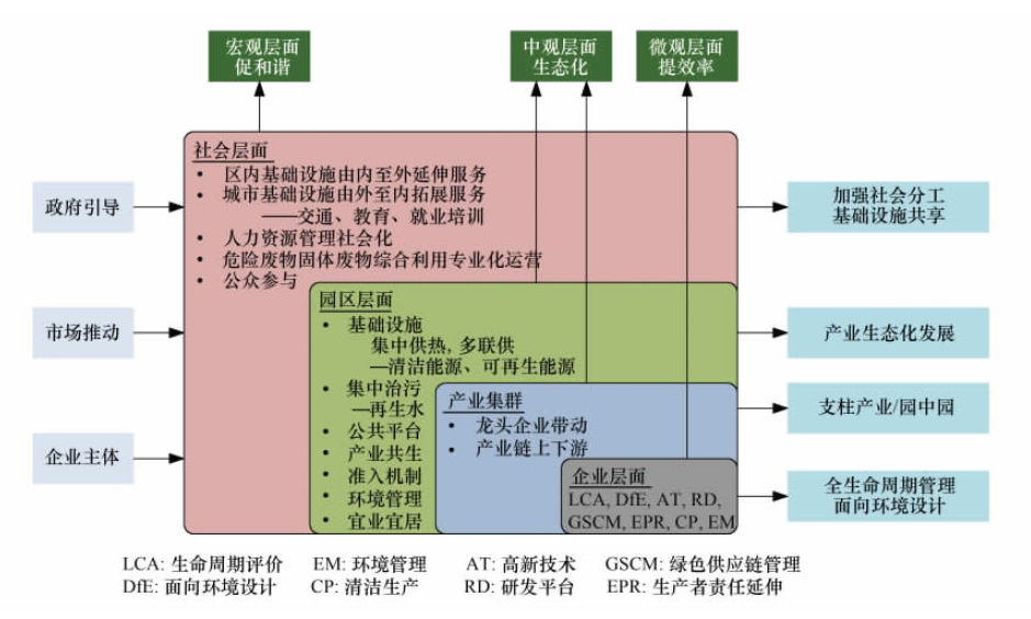 我國(guó)實(shí)施可持續(xù)發(fā)展戰(zhàn)略要求發(fā)展生態(tài)工業(yè),打破“綠色壁壘”也需要工業(yè)的生態(tài)化發(fā)展,可以說,生態(tài)工業(yè)是我國(guó)工業(yè)發(fā)展的必然選擇。生態(tài)工業(yè)理念被引入中國(guó)后,原國(guó)家環(huán)??偩钟?000年開始推動(dòng)生態(tài)工業(yè)園區(qū)建設(shè),發(fā)展過程中逐步形成了“有標(biāo)準(zhǔn)可依,依標(biāo)準(zhǔn)建設(shè),據(jù)標(biāo)準(zhǔn)考核,示范試點(diǎn)帶動(dòng),建立長(zhǎng)效機(jī)制”的發(fā)展路線圖。鑒于開發(fā)區(qū)面臨的嚴(yán)峻環(huán)境保護(hù)形勢(shì),國(guó)家稅收政策調(diào)整、資源和能源緊缺、環(huán)保標(biāo)準(zhǔn)提高等伴隨的發(fā)展壓力,以及節(jié)能減排科技需求,2007年環(huán)保部、商務(wù)部、科技部聯(lián)合,加強(qiáng)對(duì)國(guó)家生態(tài)工業(yè)示范園區(qū)建設(shè)的推進(jìn)。生態(tài)工業(yè)示范園區(qū)是依據(jù)清潔生產(chǎn)要求、循環(huán)經(jīng)濟(jì)理念和工業(yè)生態(tài)學(xué)原理而設(shè)計(jì)建立的一種新型工業(yè)園區(qū)。它通過物流或能流傳遞等方式把不同工廠或企業(yè)連接起來,形成共享資源和互換副產(chǎn)品的產(chǎn)業(yè)共生組合,使一家工廠的廢棄物或副產(chǎn)品成為另一家工廠的原料或能源,模擬自然系統(tǒng),在產(chǎn)業(yè)系統(tǒng)中建立“生產(chǎn)者—消費(fèi)者—分解者”的循環(huán)途徑,尋求物質(zhì)閉環(huán)循環(huán)、能量多級(jí)利用和廢物產(chǎn)生最小化。