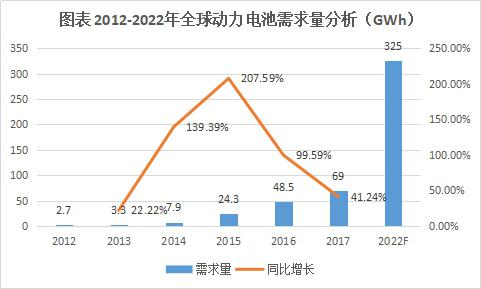 2017年全球應(yīng)用于電動汽車動力電源規(guī)模為69.0GWh,是消費電子、動力、儲能三大板塊中增量最大的板塊。GGII預(yù)計到2022年全球電動汽車鋰電池需求量將超過325GWh,相比2017年增長3.7倍。