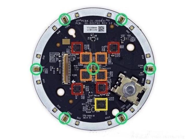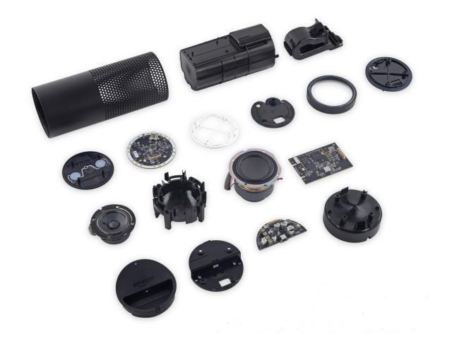 下圖展示了 Echo 拆解后的部件??梢钥吹?,智能音箱的硬件并不算復雜(相對于無人駕駛等“重型”AI 產(chǎn)品)。