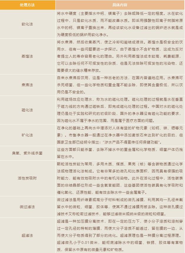 水質(zhì)處理方式有以下十類(lèi):軟化法、蒸餾法、煮沸法、磁化法、礦化法、臭氧紫外線(xiàn)殺菌、活性炭吸附、RO逆滲透膜、微過(guò)濾、超過(guò)濾。