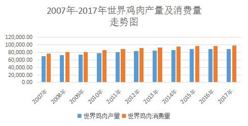 近年來(lái),雞肉產(chǎn)量、銷(xiāo)量呈快速上升趨勢(shì)。根據(jù)wind統(tǒng)計(jì)數(shù)據(jù),世界雞肉生產(chǎn)量保持穩(wěn)定增長(zhǎng),從2007年的69447千噸,增長(zhǎng)到2017年6月的89470千噸,世界雞肉消費(fèi)量從2007年的76487千噸,增長(zhǎng)到2017年6月的98771千噸。