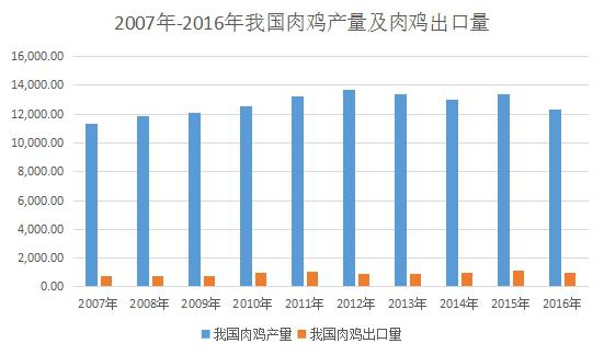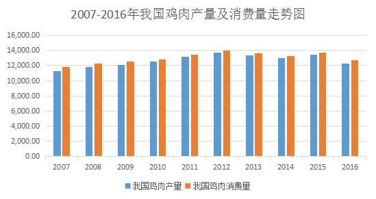 從2007年開(kāi)始,受H7N9疫情和成本快速上升等因素的困擾,中國(guó)雞肉生產(chǎn)進(jìn)入了平穩(wěn)發(fā)展時(shí)期,雖然增長(zhǎng)速度有所減緩,但是增長(zhǎng)趨勢(shì)依然強(qiáng)勁。2007年至2012年,我國(guó)雞肉年產(chǎn)量及消費(fèi)量持續(xù)增長(zhǎng),2013年以來(lái)受疫情、中央八項(xiàng)規(guī)定等因素的影響,雞肉年產(chǎn)銷(xiāo)量略有下降,但始終保持在1,300萬(wàn)噸以上的水平。雞肉產(chǎn)量從2007年的11291千噸增長(zhǎng)至2016年的12300千噸,雞肉消費(fèi)量從2007年的11773千噸增長(zhǎng)至2016年的12730千噸。