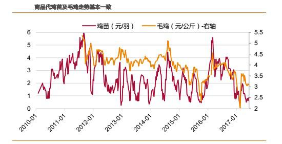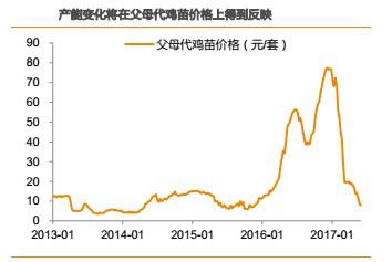 引種規(guī)模的下降意味著祖代存欄的下降,供給的減少將導(dǎo)致父母代雞苗銷(xiāo)售價(jià)格下降。由于2012年以前國(guó)內(nèi)白羽肉雞需求快速增加,因此,國(guó)內(nèi)白羽雞引種規(guī)增速的下降也會(huì)引起價(jià)格的上漲。例如,2010年的引種規(guī)模與2009年基本持平,僅增長(zhǎng)3萬(wàn)套。受此影響,父母代雞苗價(jià)格也從2010年9月份開(kāi)始反彈。同樣的,隨著2014年引種規(guī)模的下降,父母代雞苗價(jià)格則從2014年3月見(jiàn)底回升,中間雖有波動(dòng),但從2015年10月即開(kāi)始一輪快速上漲。也就是說(shuō),對(duì)于祖代產(chǎn)能的變化,父母代雞苗價(jià)格是一個(gè)重要的驗(yàn)證指標(biāo)。