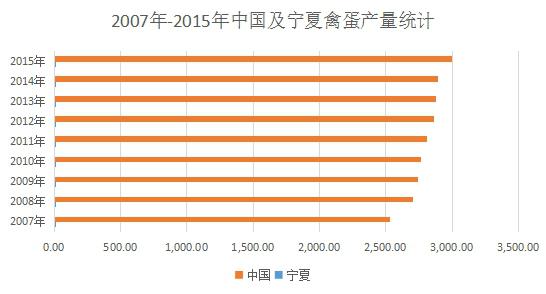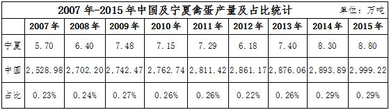 寧夏不僅是在出欄量上所占比重較低,在產(chǎn)量上也并不樂(lè)觀。2015年底,中國(guó)總體禽蛋產(chǎn)量為2999.22萬(wàn)噸,而寧夏僅8.8萬(wàn)噸,占全國(guó)的0.29%。2007年以來(lái),寧夏禽蛋產(chǎn)量占比在0.23%~0.29%之間,2014年占比達(dá)到最高。