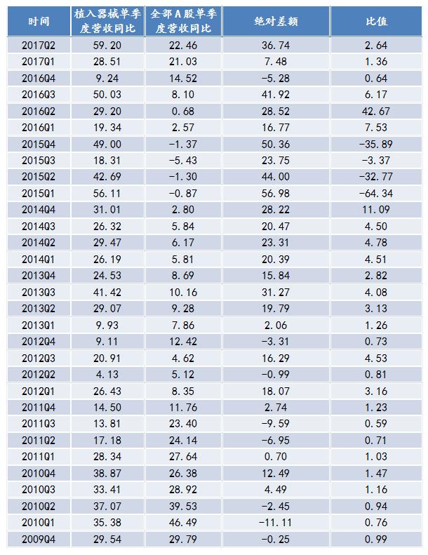 根據(jù)與全部A股營收相比較,在2012年之前,植入器械的營收總體上與全部A股的保持一致。2012年之后,全部A股的營收變動相對平緩;而植入器械行業(yè)營收基本高于全部A股營收,在2016年經(jīng)歷谷值之后,行業(yè)保持增長的趨勢。