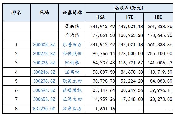 通過對植入器械上市公司的盈利做出預測,上市公司總收入的平均值在2017年、2018年預計分別是130,963.28萬元、173,645.26萬元,相對于2016年的77,051.30萬元,呈現(xiàn)逐年增長的趨勢;其上市公司盈利最高值預測值在2017年、2018年分別達到442,021.18萬元、561,338.86,相較于2016年的341,912.49萬元,呈現(xiàn)逐年增長的趨勢,市場總體看好植入器械上市公司。