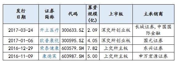 從2016年8月17日至2017年8月17日,植入器械行業(yè)上市公司股權(quán)融資主要有開立醫(yī)療、歐普康視、榮泰健康、康德萊,分別是深交所創(chuàng)業(yè)板、上交所主板的上市公司,通過IPO方式融資,募資規(guī)模分別為2.09億元、4.05億元、7.82億元、5.00億元。