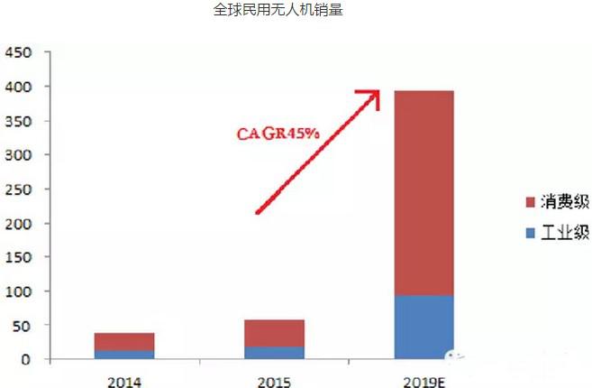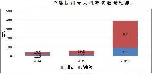 全球民用無人機在2014年迎來大約37.8萬架的銷量,其中工業(yè)級無人機銷量約12.6萬架,消費級無人機銷量約25.2萬架。在2015年大約銷售民用無人機56.9萬架,其中,工業(yè)級無人機銷量約17.1萬架,消費級無人機銷量約39.8萬架。IDC預(yù)測,到2019年全球無人機年銷量將達到393萬架,其中消費級300萬臺,CAGR達到60%;工業(yè)級無人機銷量為93萬臺,CAGR達到45%。