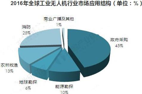 從應(yīng)用結(jié)構(gòu)來看,當(dāng)前全球工業(yè)無人機行業(yè)中45%為政府采購,能源勘探和地球勘探的應(yīng)用占比分別為10%和6%,農(nóng)林牧漁的應(yīng)用占比約為13%,在消防領(lǐng)域的應(yīng)用占比達到25%。