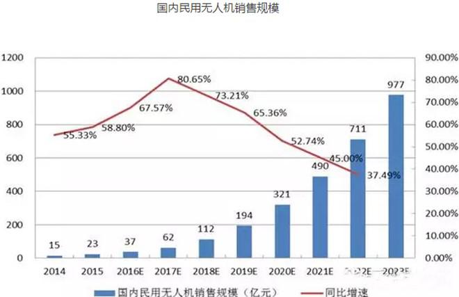2014年國內(nèi)民用無人機產(chǎn)品銷售規(guī)模15億元,2015年銷售規(guī)模23.3億元,同比增長55.3%。據(jù)IDC數(shù)據(jù)預(yù)測,2019年中國民用無人機市場銷售規(guī)模達到390萬臺,合計約600億元。預(yù)計到2023年,國內(nèi)民用無人機市場規(guī)模將會達到976.9億元,年復(fù)合增長率59%。