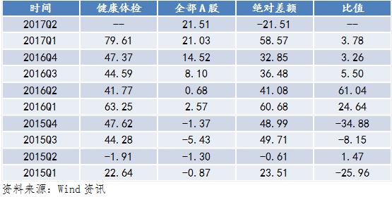 根據(jù)圖1數(shù)據(jù)顯示,從2015年第一季度到2017年第二季度,與全部A股相比,健康體檢行業(yè)的單季度營(yíng)收同比總體處于較高水平,并表現(xiàn)為波動(dòng)增長(zhǎng)的趨勢(shì)。