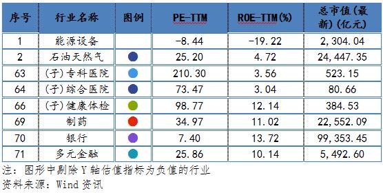 健康體檢行業(yè)市盈率(PE)為98.77,其凈資產(chǎn)收益率(ROE)為12.14%,相較其他行業(yè)而言處于較高位置;健康體檢行業(yè)的總市值為384.53億元,相較其他行業(yè)而言,處于較低水平。
