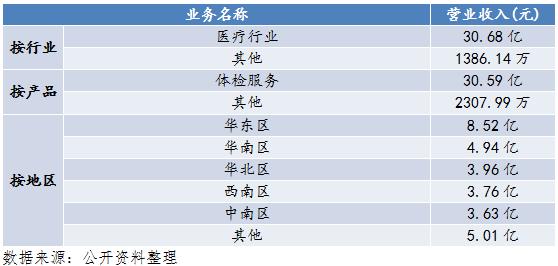 圖5、6、7是美年健康的營(yíng)業(yè)收入構(gòu)成圖。按行業(yè)分,營(yíng)業(yè)收入中,醫(yī)療行業(yè)占比99.55%,其他占比0.45%;按產(chǎn)品分,營(yíng)業(yè)收入中,體檢服務(wù)占比99.25%,其他占比0.25%;按地區(qū)分布,營(yíng)業(yè)收入中,華東區(qū)、華南區(qū)、華北區(qū)、西南區(qū)、中南區(qū)、其他分別占比為28.57%、16.57%、13.28%、12.61%、12.17%、16.80%。