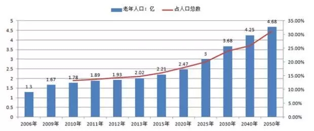 2004年底,中國60歲及以上老年人口為1.43億,2013年我國60歲及以上老年人口達(dá)2億人。截止2016年底,我國60歲以上的老齡人口高達(dá)2.3億人,位居世界之首。20世紀(jì)后期,為控制人口的急劇增長,國家推行計(jì)劃生育政策,使得人口出生率迅速下降,加快了中國人口老齡化的進(jìn)程。由于下世紀(jì)前半葉人口壓力仍然沉重,還要繼續(xù)堅(jiān)持計(jì)劃生育的國策,其結(jié)果將不可避免地使中國提早達(dá)到人口老齡化高峰。在第六次全國人口普查主要數(shù)據(jù)顯示,我國60歲及以上人口占13.26%,比2000年人口普查上升2.93個百分點(diǎn),其中65歲及以上人口占8.87%,比2000年人口普查上升1.91個百分點(diǎn),而且老年人口比例還以每年超過3%的速度增長,預(yù)計(jì)2025年將達(dá)到19.7%,到那時,每五個中國人就有一個是60歲以上的人。按國家統(tǒng)計(jì)局2005年出版的報告,現(xiàn)在出生的中國人,男性平均壽命是69.6歲,女性的預(yù)期壽命是73.5歲。