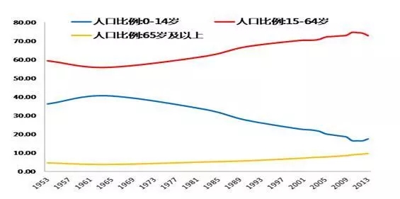 65歲以上老年人占總?cè)丝诘谋壤龔?%提升到14%,發(fā)達(dá)國家大多用了45年以上的時間。中國只用27年就可以完成這個歷程,并且將長時期保持很高的遞增速度,屬于老齡化速度最快國家之列。預(yù)計(jì)到2045年左右,中國60歲以上人口將占到總?cè)丝诘?0%。該過程發(fā)達(dá)國家用了100年。圖2為1953年到2013年60年的人口比例變化情況,中國的高齡化趨勢明顯。