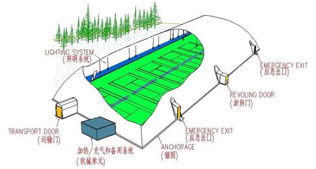 氣膜建筑也稱為“空氣支撐結(jié)構(gòu)”—air supported structure,是以特殊的建筑膜材為建筑外殼,并配備一套智能化的運(yùn)行控制系統(tǒng)為完全密閉的氣膜建筑內(nèi)部提供空氣壓力,使整體建筑內(nèi)部始終保持對(duì)外部環(huán)境的正壓,從而靠?jī)?nèi)、外部壓力差把建筑主體支撐起來的一種建筑結(jié)構(gòu)系統(tǒng)。一套完整的氣膜建筑系統(tǒng)還包括了照明系統(tǒng)和門禁系統(tǒng)。