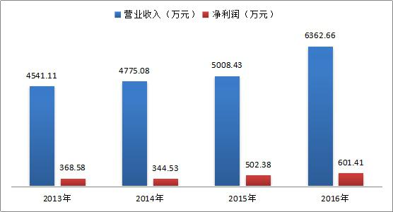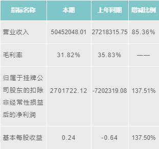 維拓環(huán)境2016年?duì)I業(yè)收入為50452048.01元,增長(zhǎng)85.36%;毛利潤為31.82%;歸屬于掛牌公司股東的扣除非經(jīng)常性損益后的凈利潤為2701722.12元,增長(zhǎng)137.51%;基本每股收益為0.24元,增長(zhǎng)137.50%。