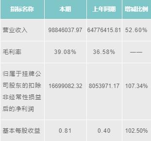 博德維2016年?duì)I業(yè)收入為98846037.97元,增長(zhǎng)52.60%;毛利潤為39.08%;歸屬于掛牌公司股東的扣除非經(jīng)常性損益后的凈利潤為16699082.32元,增長(zhǎng)107.34%;基本每股收益為0.81元/股,增長(zhǎng)102.50%。