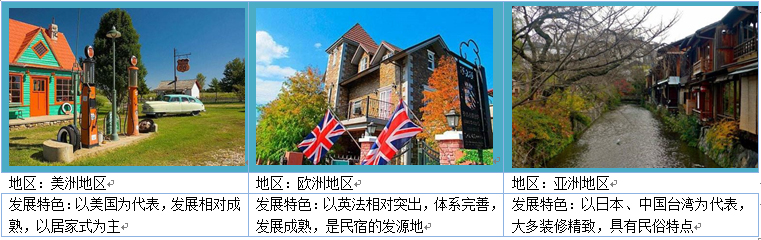 發(fā)展特色:以美國為代表,發(fā)展相對成熟,以居家式為主 發(fā)展特色:以英法相對突出,體系完善,發(fā)展成熟,是民宿的發(fā)源地 發(fā)展特色:以日本、中國臺灣為代表,大多裝修精致,具有民俗特點