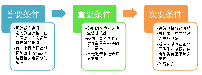 客棧民宿開發(fā)的條件主要可以分為以下三個層級,在開發(fā)過程中要注意這三類條件的層次,保證首要條件的情況下盡量滿足另外兩個層級的條件。