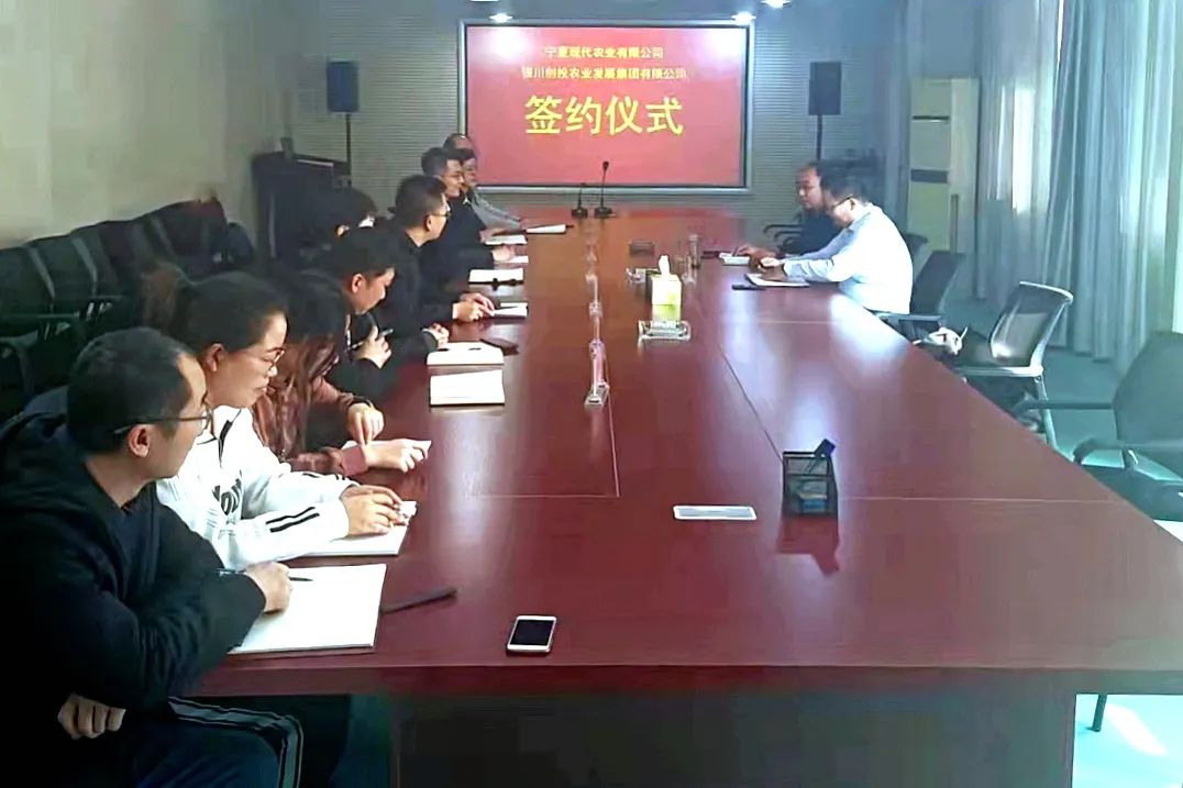 為進一步強化國企合作,增強業(yè)務拓展、優(yōu)勢互補,切實提高合作質效,匯聚推進合力,近日,寧夏現(xiàn)代農(nóng)業(yè)有限公司(以下簡稱“現(xiàn)代農(nóng)業(yè)公司”)與銀川創(chuàng)投農(nóng)業(yè)發(fā)展集團有限公司(以下簡稱“創(chuàng)投集團”)舉行了合作協(xié)議簽約儀式。寧夏現(xiàn)代農(nóng)業(yè)有限公司總經(jīng)理張亞東,銀川創(chuàng)投農(nóng)業(yè)發(fā)展集團有限公司總經(jīng)理盛軍出席本次簽約儀式。