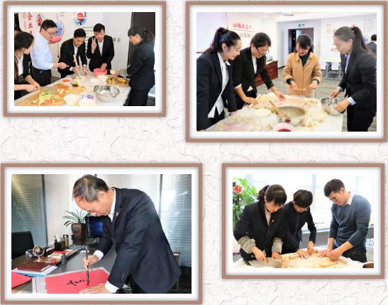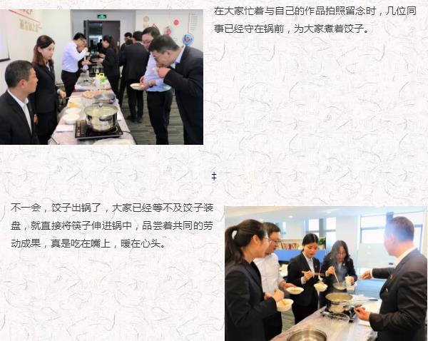 大家分成“愛吃餃子”“會(huì)做餃子”“多彩生活”和“幸?;▋骸彼膫€(gè)組合,展開了包餃子比賽。只見他們熟練的搟面皮、放餡料、捏餃子,十指翻飛之間,剁餡聲、歡笑聲、音樂聲,交織在一起,每個(gè)人臉上都洋溢著燦爛的笑容,公司里充滿了歡聲笑語,匯聚成了一片歡樂的海洋。